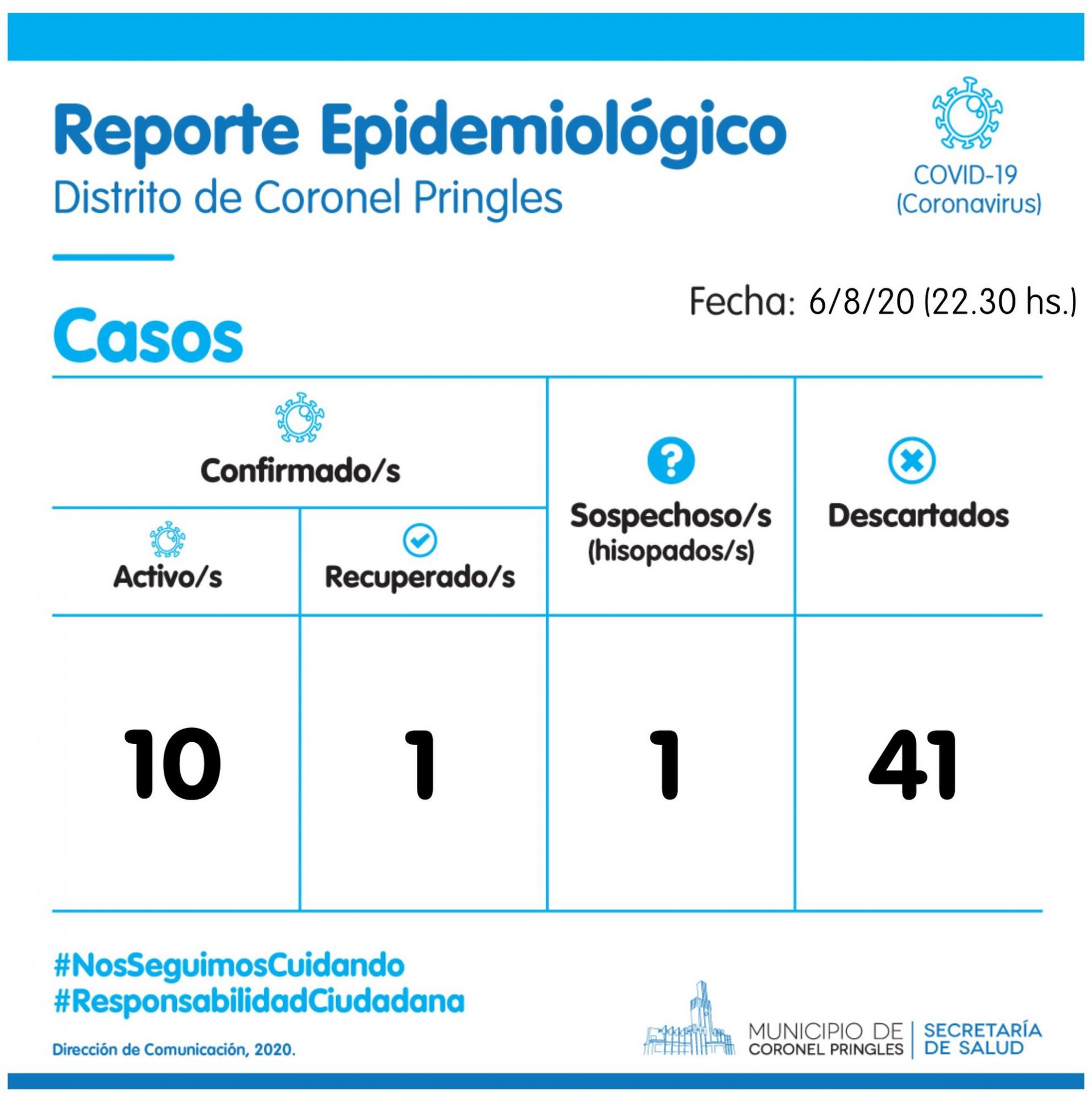 El área de Prensa del Municipio local anunció hoy que llegaron los resultados de los 10 hisopados realizados ayer (miércoles 5 de agosto): 8 resultaron positivos y 2 negativos. Estos últimos pasan a ser considerados casos descartados.