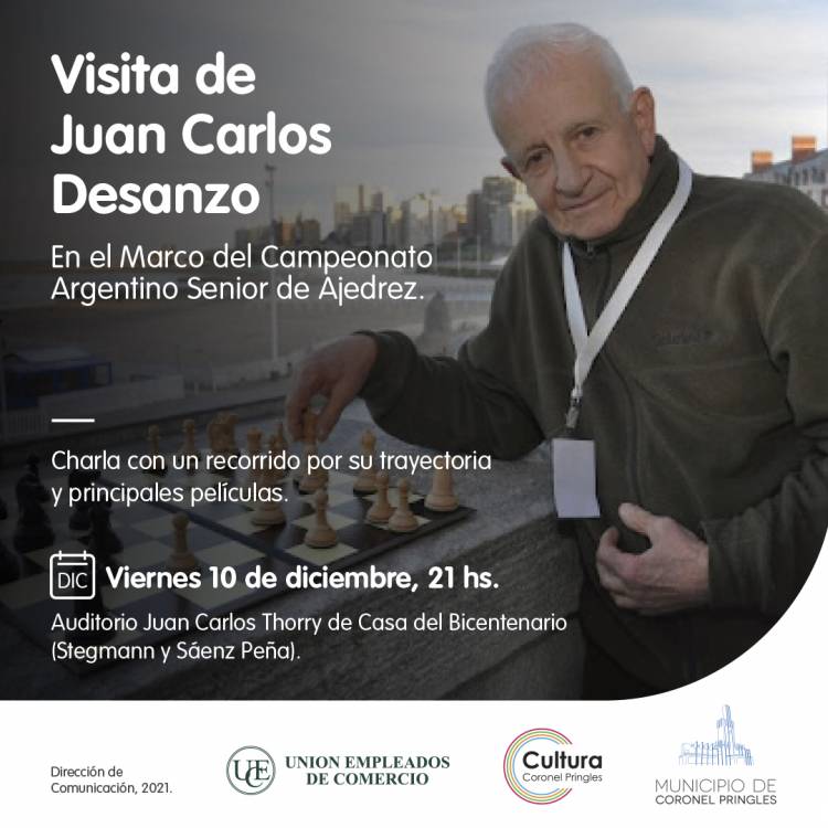 Ese viernes, a las 21 hs., tendrá lugar una interesante Charla con Juan Carlos Desanzo, destacado director de cine argentino, quien hará un recorrido por su trayectoria cinematográfica y principales películas. La actividad será con entrada libre y gratuita en el Auditorio Juan Carlos Thorry de Casa del Bicentenario (Stegmann y Sáenz Peña). Desanzo será, además, uno de los jugadores de este campeonato.