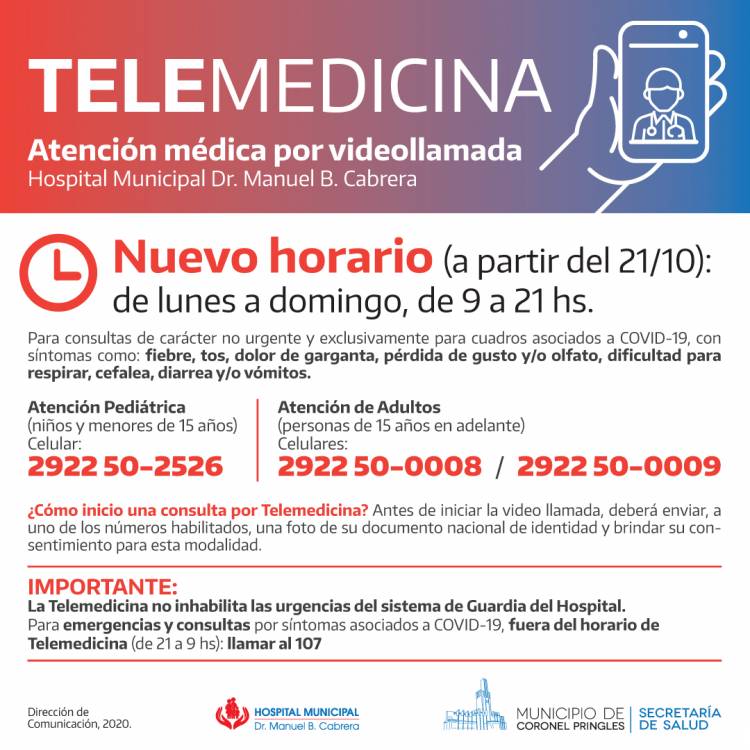 Desde el miércoles 21 de octubre, se modifica el horario de Telemedicina. Si bien el servicio de atención médica por videollamada funcionará de la misma manera, para consultas no urgentes y vinculadas a patologías por Covid tales como afecciones respiratorias y a cuadros que están descriptos como posibles Covid, el Secretario de Salud señaló que “los médicos del grupo (de Telemedicina) las irán canalizando de 9 a 21 horas, todos los días”.