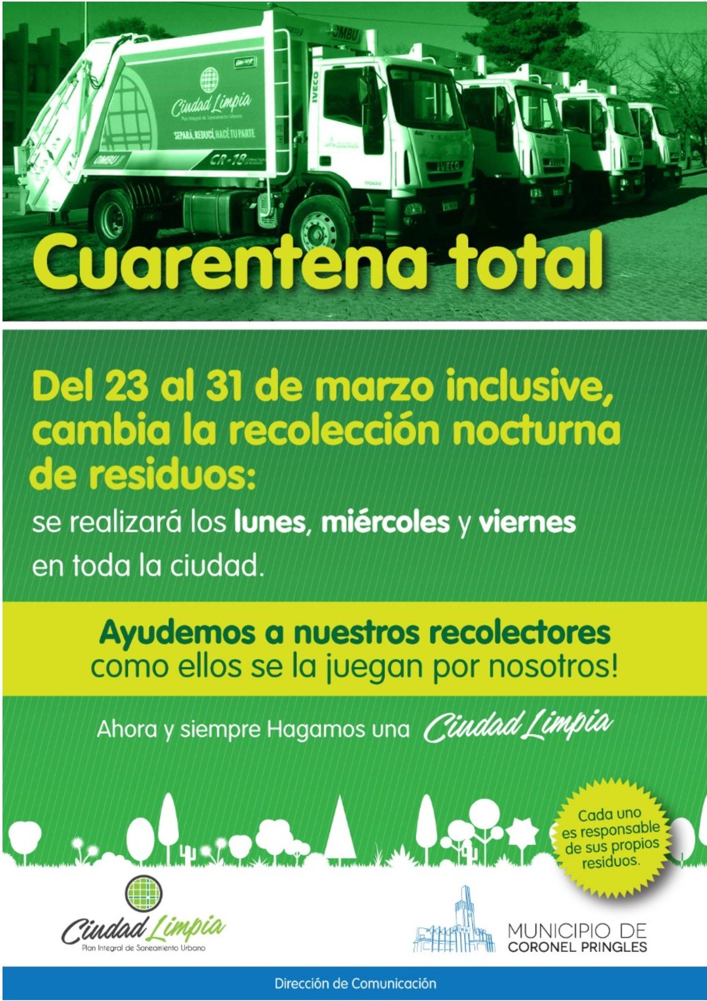 En virtud de la cuarentena total, hemos tomado la decisión de cambiar desde el 23 al 31 de marzo inclusive, la recolección de residuos en Pringles. Esto es para cuidar a nuestros recolectores y a sus familias (andando menos en la calle).