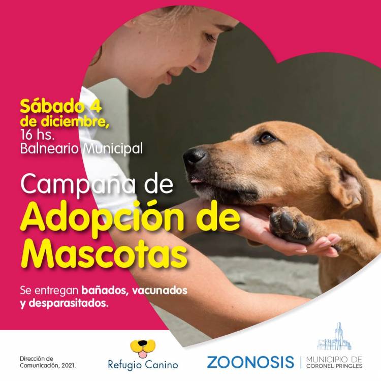 Vera Barrantes, responsable del área de Zoonosis de la comuna, indicó que “estamos programando, para este sábado 4 de diciembre, una campaña de adopción de mascotas en el Balneario Municipal a partir de las 16 horas”.