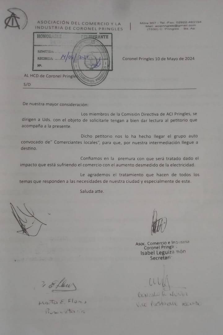 - Por la presente vecinos y comerciantes de Coronel Pringles, nos dirigimos al ente regulador, acercando probanzas de acciones realizadas ante órganos legislativos locales, ejecutivos provinciales y ante la cooperativa eléctrica local