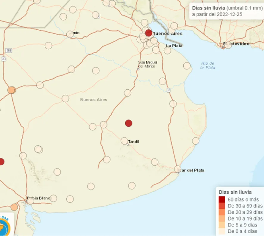 Entre las herramientas que se encuentran disponibles en el SISSA, es posible determinar las regiones en los que hace más de dos meses que no llueve, como son los casos bonaerenses de Arrecifes y Rauch. A la vez que en Bolívar tampoco cae agua desde hace 30 a 59 días.