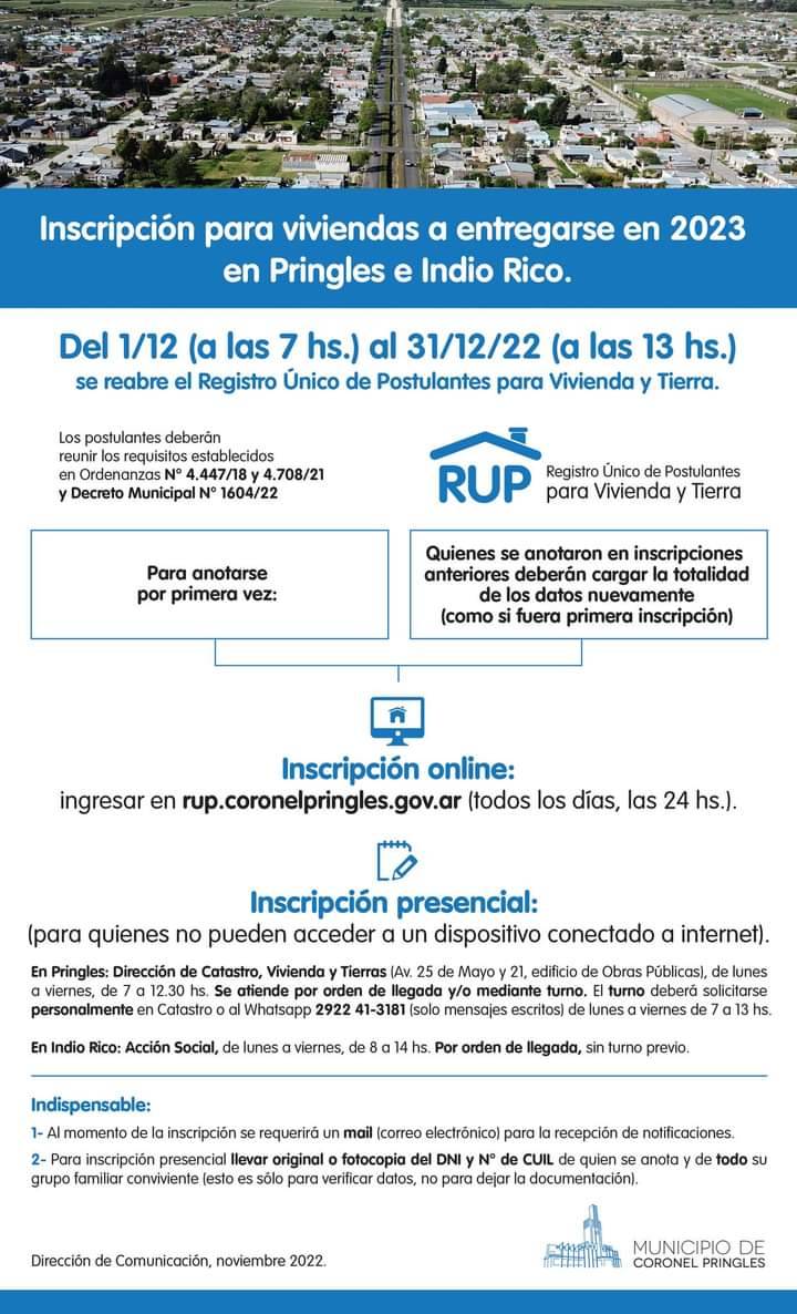 Las inscripciones que se realicen durante ese mes, a través del Registro único de Postulantes para Vivienda y Tierra, serán las que se utilicen para la adjudicación de viviendas en Pringles e Indio Rico durante el 2023. Para anotarse habrá dos modalidades: online y presencial.