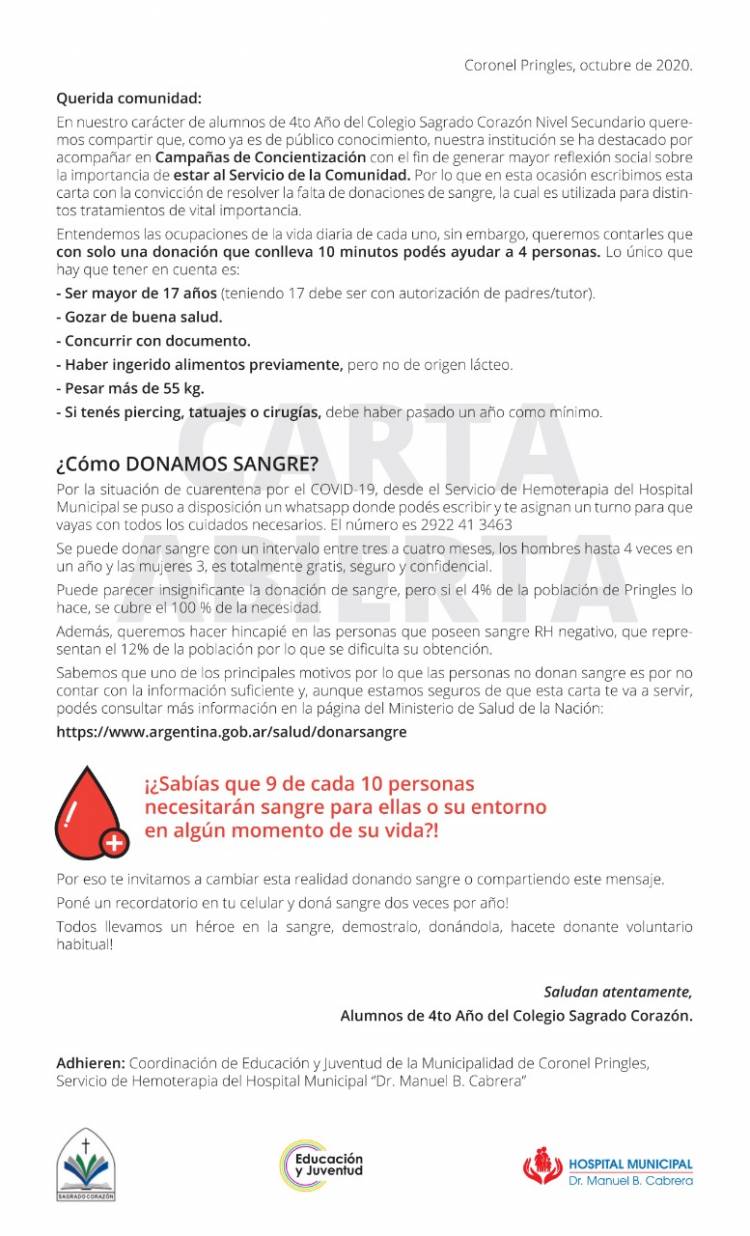 En la nota, expresan los estudiantes "Nuestra institución de ha destacado por acompañar en Campañas de Concientización con el fin de generar mayor reflexión social sobre la importancia de estar al Servicio de la Comunidad. Por lo que en esta ocasión escribimos esta carta con la convicción de resolver la falta de donaciones de sangre, la cual es utilizada para distintos tratamientos de vital importancia".
