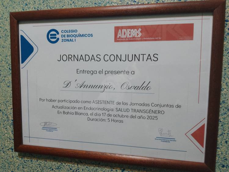 El bioquímico de Coronel Pringles, Osvaldo D´Annunzio, participó de la jornada de actualización y capacitación sobre Endocrinología, tratando el tema de Salud Trangénero realizada en Bahía Blanca. El evento tuvo la presencia del Jefe de Laboratorio y profesionales de Endocrinología del Hospital Italiano de Buenos Aires. Con más de 40 años en la profesión Osvaldo sigue formándose en su profesión.