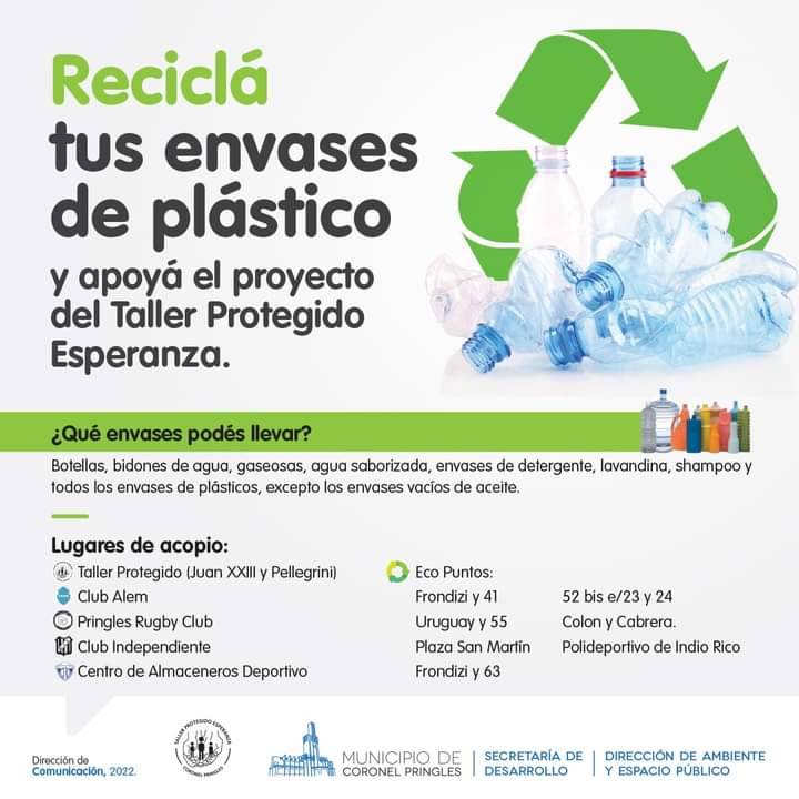Además, los Eco Puntos que recolectan plásticos: Frondizi y 41, Uruguay y 55, Plaza San Martín, Frondizi y 63, 52 bis e/23 y 24, Colon y Cabrera y el ubicado en el Polideportivo de Indio Rico, envían las botellas al Taller de Reciclado del Taller Protegido Esperanza.