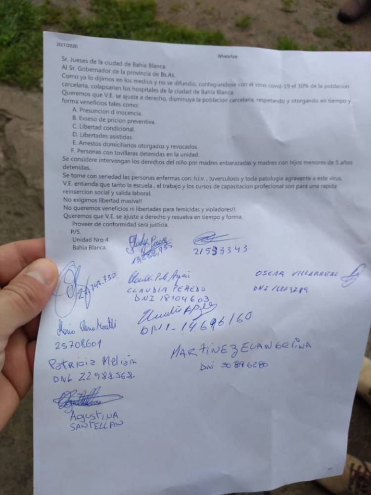 "Queremos que vuestra excelencia se ajuste a derecho, disminuya la población carcelaria, respetando y otorgando en tiempo y forma beneficios tales como presunción de inocencia, exceso de prisión preventiva, libertad condicional, libertades asistidas, arrestos domiciliarios otorgados y revocados, personas con tobilleras detenidas en la unidad".
