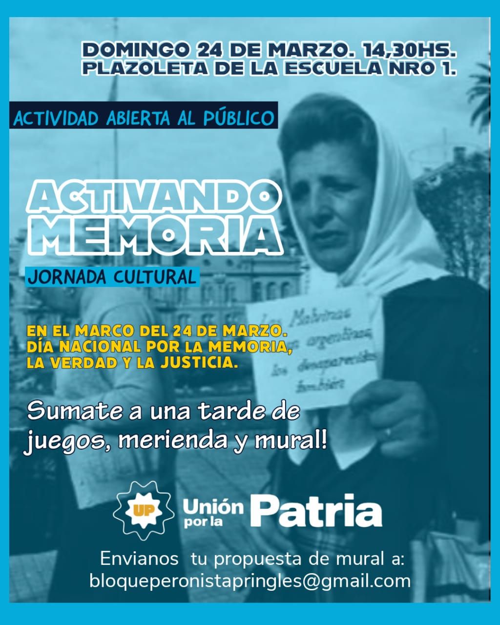 Distintas organizaciones del peronismo en Coronel Pringles, realizarán una tarde de juegos, merienda y mural en conmemoración del Día Nacional por la Memoria, la Verdad y la Justicia. Será el domingo, a partir de las 14:30 hs, en la Plazoleta de la Escuela 1.