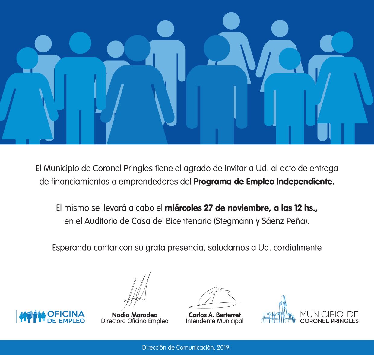 Mañana miércoles 27 de noviembre, a las 12 hs., en Casa del Bicentenario el Municipio de Coronel Pringles, realizará un acto de entrega de financiamientos a emprendedores del Programa de Empleo Independiente.