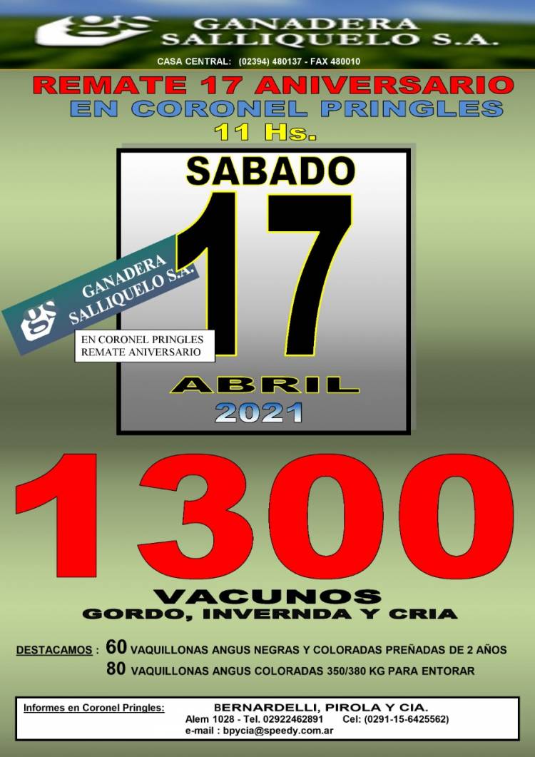 La firma Bernardelli, Pirola y Cía de Coronel Pringles, representante de Ganadera Salliqueló SA., hará su Remate Feria el próximo Sábado 17 de Abril de 2021 en el predio ferial de la Sociedad Rural local, a partir de las 15 horas.
