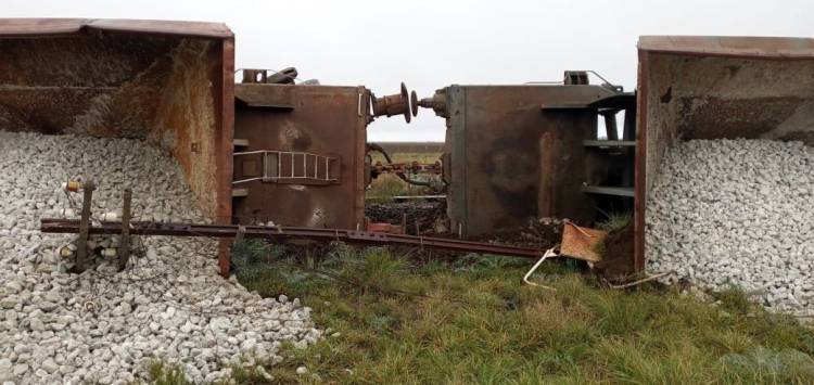 Cinco vagones detenidos por abandono del Ramal Pringles, dos volcados y 100 mts de vías destruídos fue el saldo de este descarrilamiento.