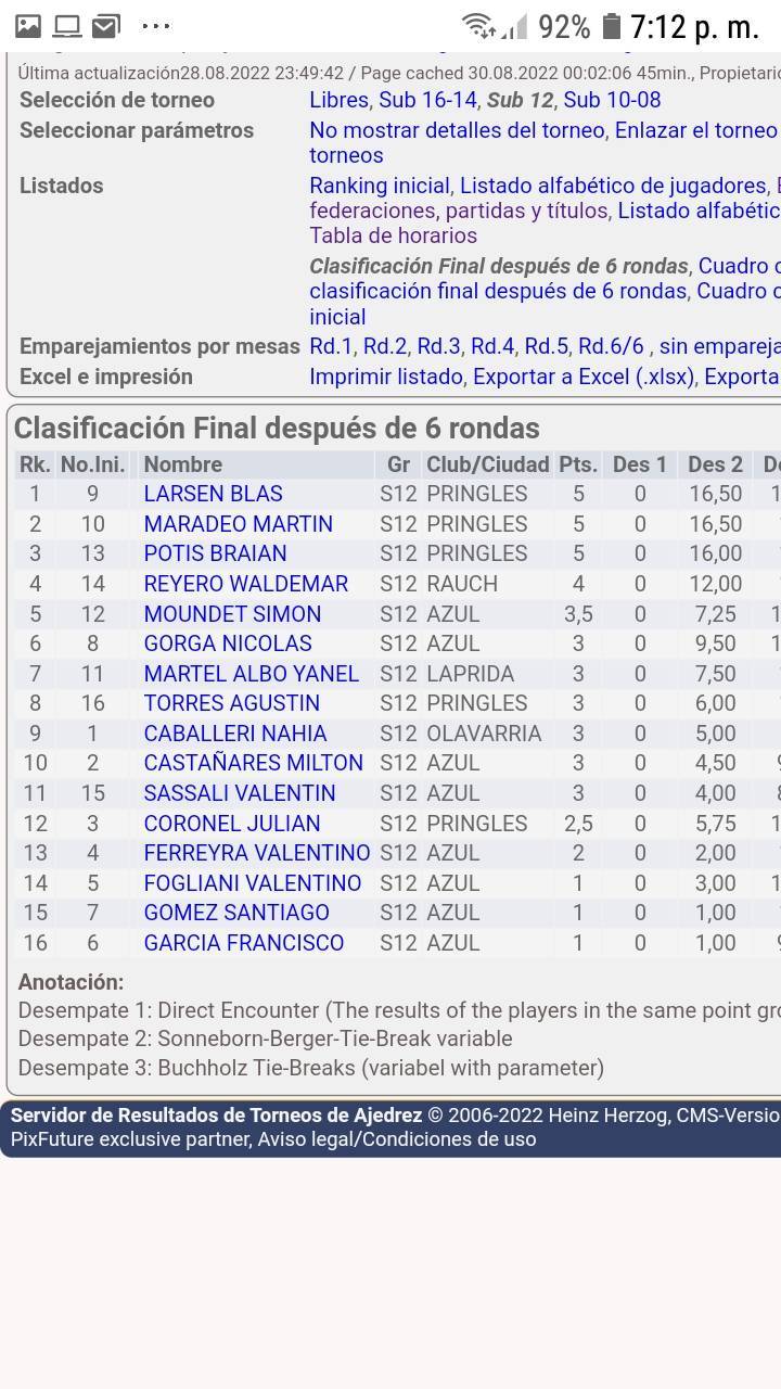 Y el sistema volvió a arrojar un empate entre Larsen y Maradeo que obligó a desempatar al segundo sistema Bucholz, que consagró como ganador del torneo Sub 12 a BLAS LARSEN (Primer triunfo en PRIX MAR Y SIERRAS)