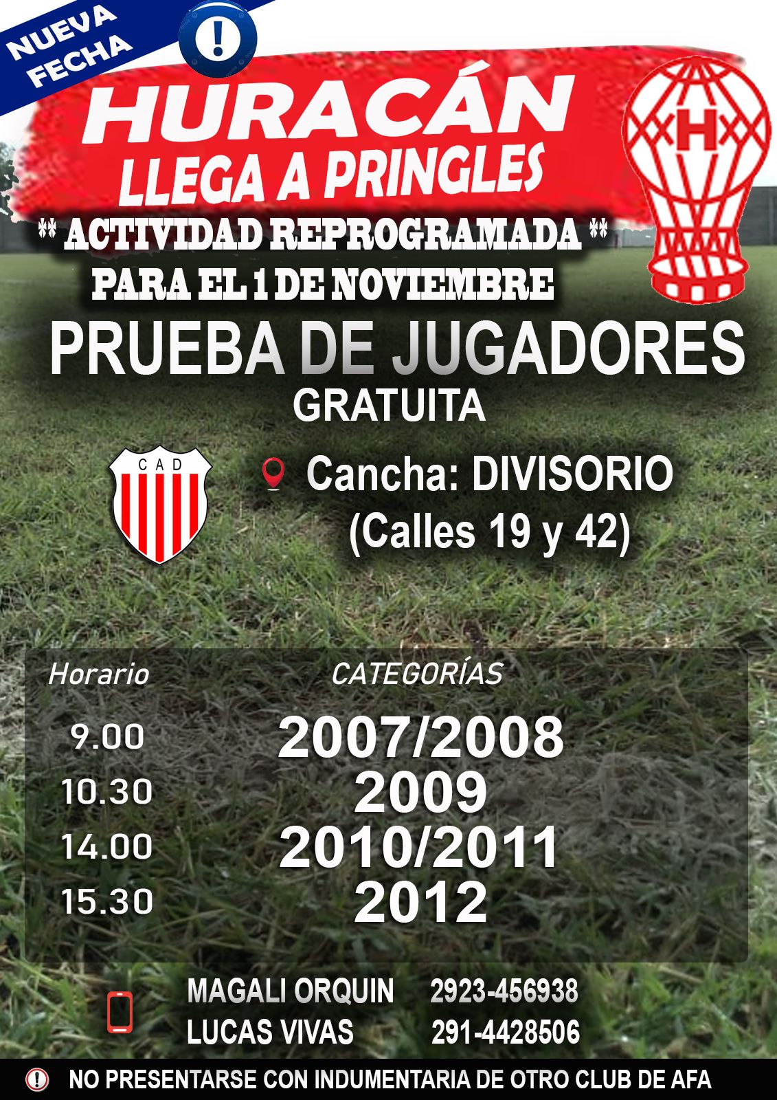 El club Huracán de Parque Patricios estará realizando pruebas de jugadores en la cancha del Club Divisorio de Coronel Pringles.