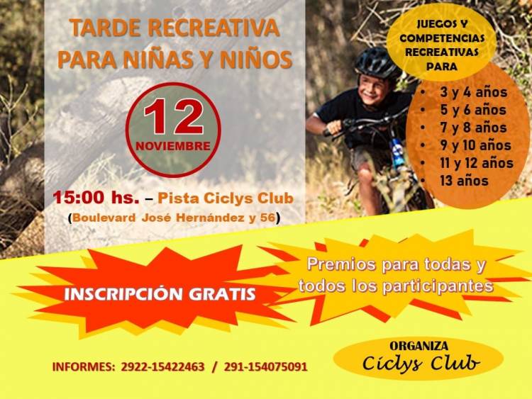La entidad local llevará a cabo el próximo domingo 12 de Noviembre una tarde recreativa para niños y niñas en su predio de 0 Bis y calle 56. La actividad dará inicio a las 15:00 hs. en forma totalmente gratuita y está destinado a peques a partir de los 3 años. Los participantes podrán correr con cualquier bicicleta adaptada para este tipo de encuentro. Habrá premios para todos los que asistan.