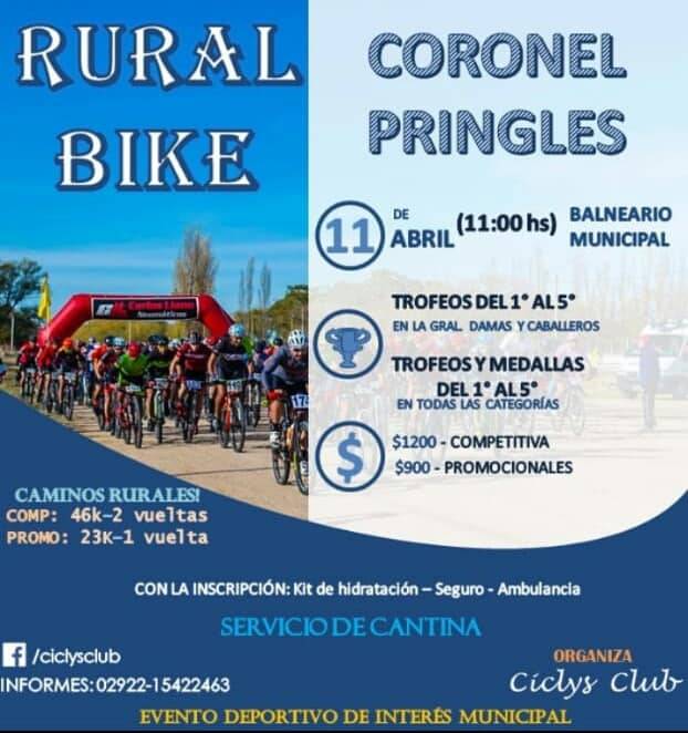 El Ciclys Club de Coronel Pringles organiza un Rural Bike para el 11 de Abril. Se correrá por caminos rurales del distrito y la actividad deportiva iniciará a partir de las 11 hs. Habrán trofeos y medallas de premios. Ya hay más de 150 preinscriptos.