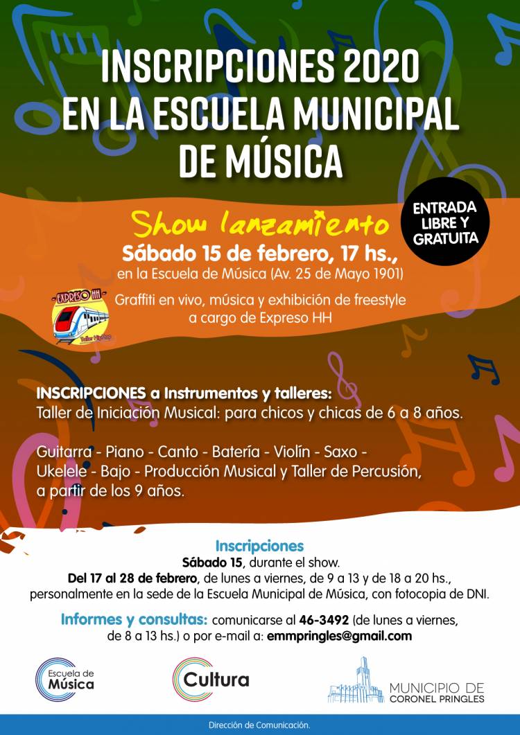 En conferencia de prensa realizada este viernes, Eugenia Cavallaro, Directora de Cultura, Educación y Patrimonio Histórico; y Lucas Dopazo, Coordinador de la Escuela Municipal de Música, anunciaron la apertura de las inscripciones con la realización de un show previsto para sábado el 15 de febrero, a partir de las 17 horas, en la sede la Escuela (Av. 25 de Mayo y calle 20). Ese mismo día, quienes ya deseen inscribirse podrán hacerlo llevando fotocopia de DNI.