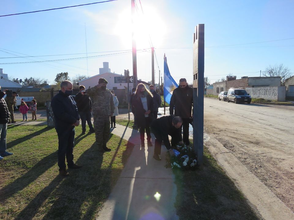 El Intendente Lisandro Matzkin y la Directora de Cultura, Eugenia Cavallaro; participaron de la colocación de la ofrenda floral al conmemorarse 38 años del retiro de las tropas argentinas de las Islas Malvinas donde se recordó al Soldado Conscripto Juan Domingo Rodríguez, nacido en nuestra ciudad y caído en combate el 14 de junio de 1982.