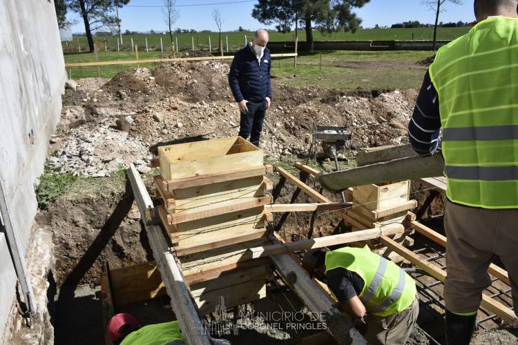 El Intendente de Coronel Pringles, Lisandro Matzkin, visitó esta mañana la construcción de las bases para las tribunas del futuro Polideportivo Municipal.