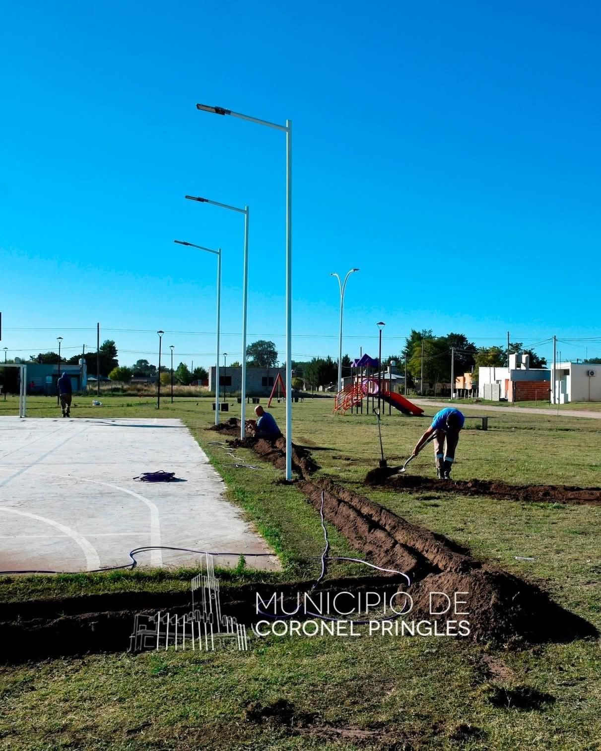El viernes pasado se inició la instalación del cableado para las nuevas luminarias del playón deportivo, que contará con seis columnas con luces LED de 150 W, mejorando la seguridad y el uso del lugar en horario nocturno.