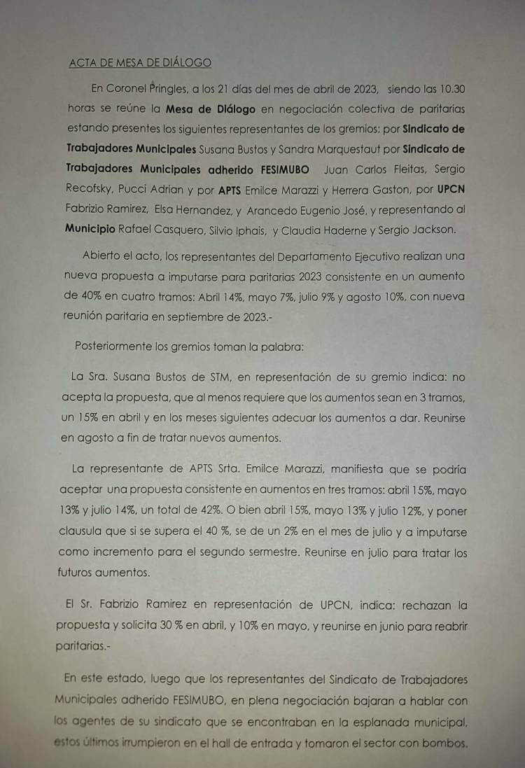 Esta mañana, como estaba previsto, se desarrollaba la reunión de la Mesa de Diálogo para definir paritaria 2023, con la presencia de referentes gremiales y del Ejecutivo. Lamentablemente, con el Palacio Municipal tomado y condiciones adversas para seguir dialogando, se tuvo que pasar a cuarto intermedio y suspender el trabajo de la Mesa.