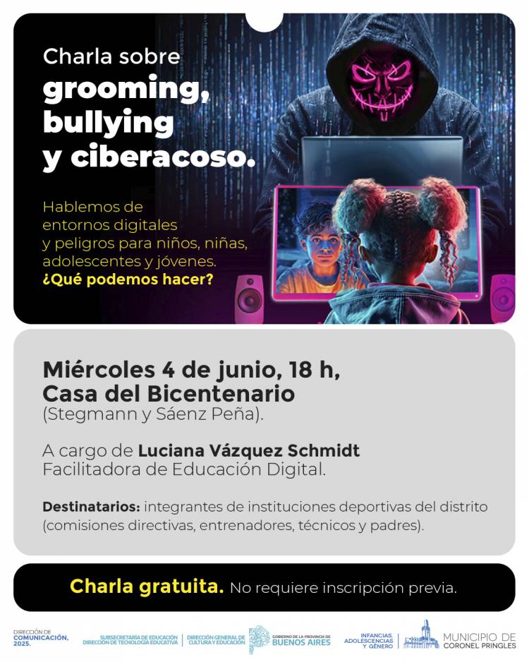 Este miércoles 4 de junio, a las 18 horas en Casa de Bicentenario, se desarrollará una charla sobre grooming, bullying y ciberacoso dirigida, en esta oportunidad, a integrantes de instituciones deportivas del distrito tales como comisiones directivas, entrenadores y técnicos.