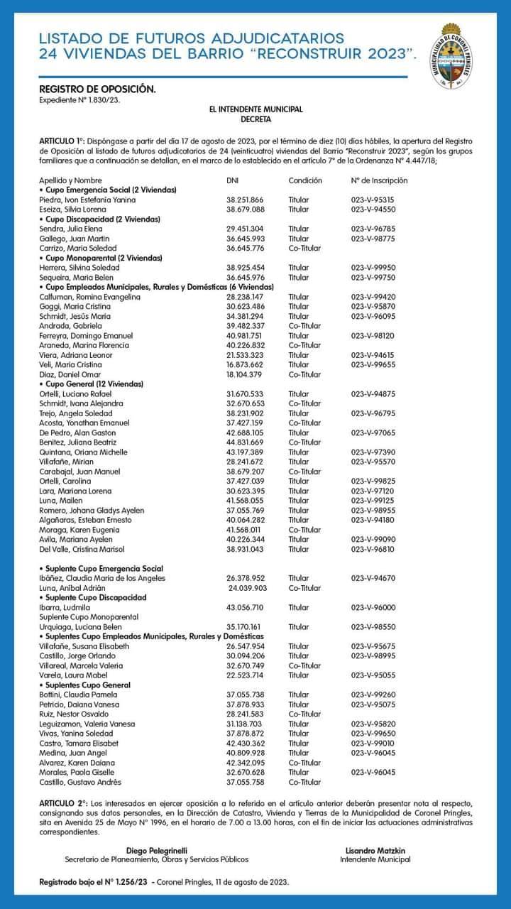 Artículo 1°: Dispóngase a partir del día 17 de agosto de 2023, por el término de diez (10) días hábiles, la apertura del Registro de Oposición al listado de futuros adjudicatarios de 24 (veinticuatro) viviendas del Barrio "Reconstruir 2023" (La Calera), según lo grupos familiares que a continuación se detallan, en el marco de lo establecido en el artículo 7° de la Ordenanza N°4.447/18.