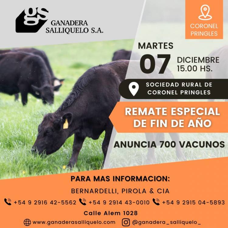 La firma Bernardelli, Pirola y Cía de Coronel Pringles, representante de Ganadera Salliqueló SA., llevará a cabo su Remate Especial de Fin de Año con 700 vacunos de Gordo, Invernada y Cría el próximo Martes 7 de Diciembre de 2021 en el predio ferial de la Sociedad Rural local, a partir de las 15:00 horas.