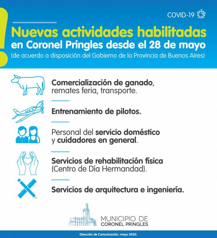 1️ A las actividades y servicios que ya venían funcionando, se agregan: comercialización de ganado, remates feria, transporte; entrenamiento de pilotos; personal del servicio doméstico y cuidadores en general; servicios de rehabilitación física (Centro de Día Hermandad) y servicios de arquitectura e ingeniería. Estas autorizaciones están determinadas por el Gobierno de la Provincia de Buenos Aires y se está a la espera de nuevas habilitaciones.