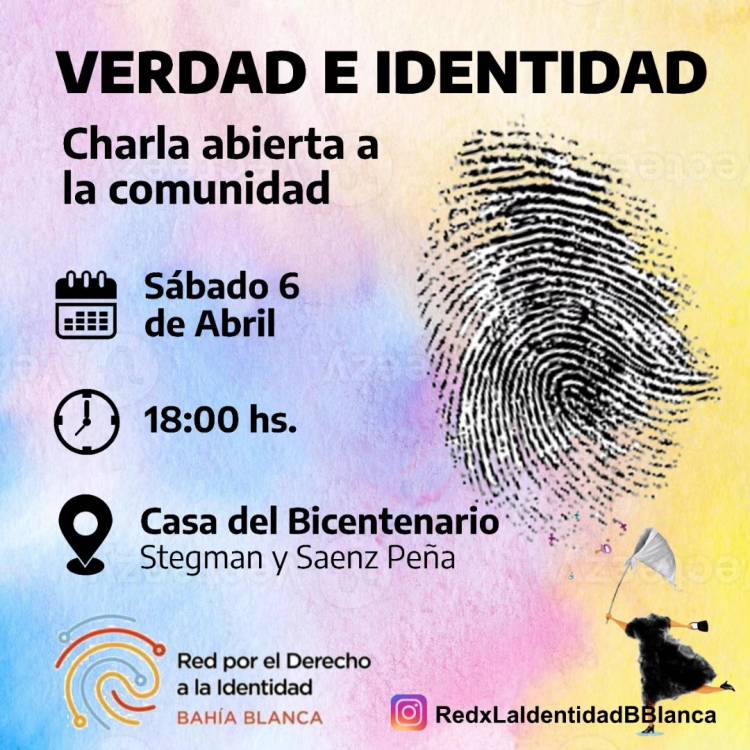 Hoy Sábado 6 de Abril a las 18 hs. en la Casa del Bicentenario se realizará la charla abierta a la comunidad "Verdad e Identidad" a cargo de la Red por el Derecho a la Identidad de Bahía Blanca.