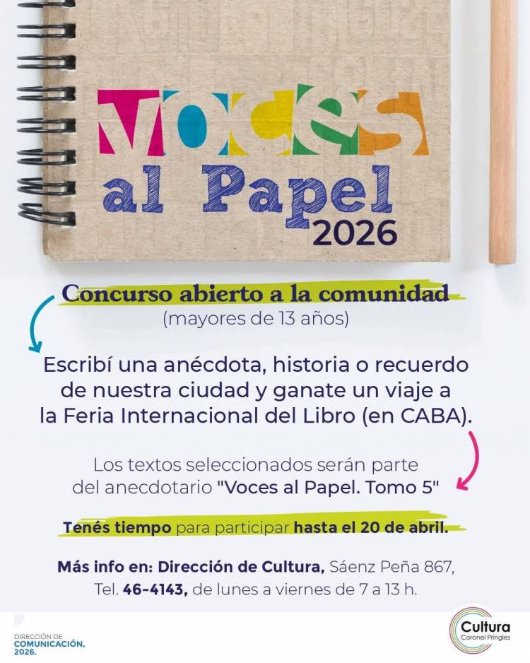 La Dirección de Cultura de Coronel Pringles invita a participar de una nueva edición de Voces al Papel.