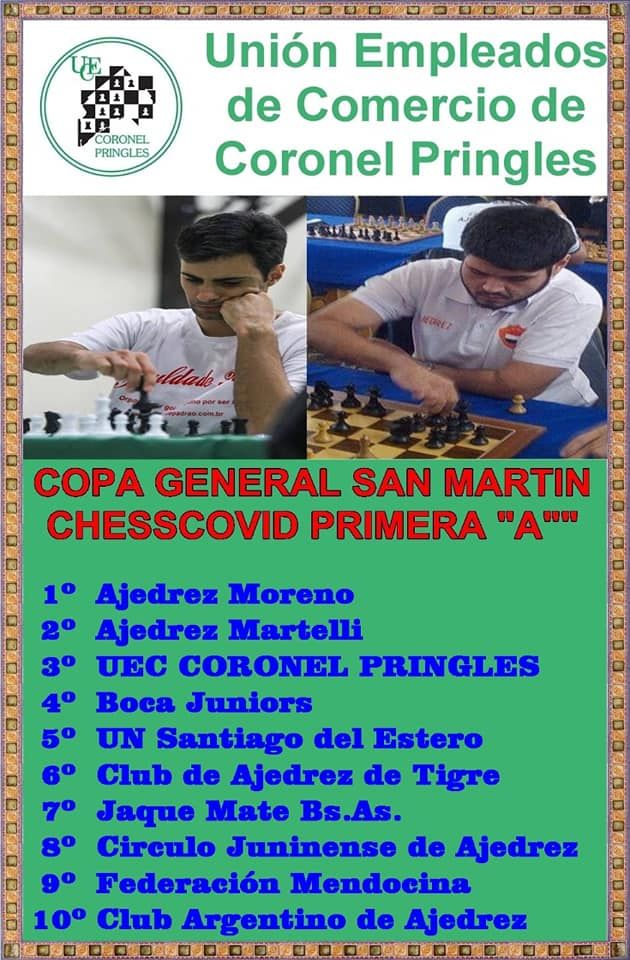 Y en la Primera Categoría, nuevamente UNIÓN EMPLEADOS DE COMERCIO DE CORONEL PRINGLES, obtuvo el tercer escalón del podio con 154 pts, siendo el campeón AJEDREZ MORENO con 192 pts y segundo AJEDREZ VILLA MARTELLI con 168 pts.