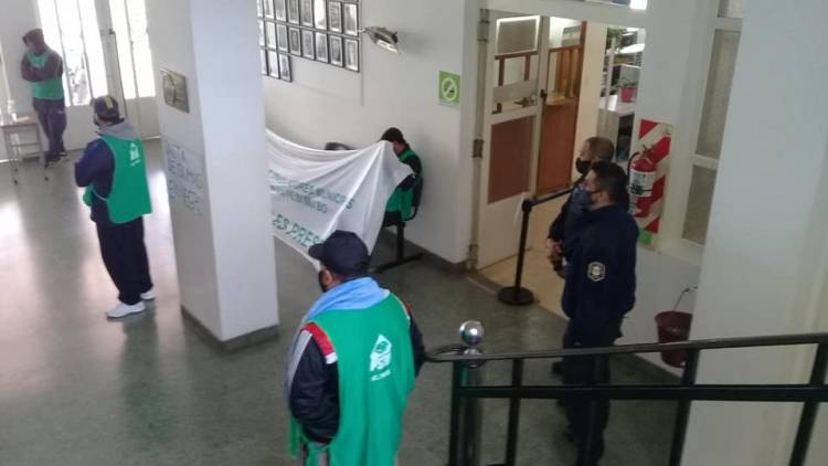 Los manifestantes se movilizaron con banderas y bombos e ingresaron al Hall interno de la Comuna. Mientras tanto dos efectivos policiales custodiaron el lugar.