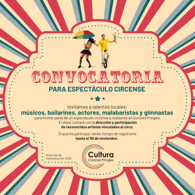 La convocatoria está destinada a talentos locales: músicos, bailarines, actores, malabaristas y gimnastas para formar parte de un espectáculo circense a realizarse en Coronel Pringles. La invitación la realizaron Eugenia Cavallaro, Directora de Cultura; Emanuel Carassou, Coordinador de Gestión Cultural y Protocolo e Ignacio Tonelli, Coordinador de Gestión Educativa y Juventud.