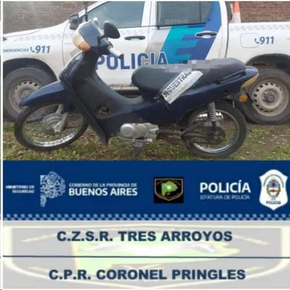 Se iniciaron actuaciones por encubrimiento a masculino de 32 años que circulaba en una moto sustraída en la vecina localidad de Tres Arroyos. El personal policial De esta Dependencia en prolongación de Boulevard 40 de este medio detuvo la Marcha de un ciclomotor 110 cc, el cual era conducido por un masculino mayor de Edad, tras consultar sus datos y los del vehículo al sistema de informática 911, la Misma arrojo como resultado que el rodado menor registraba un secuestro activo Desde el año 2020 por el Juzgado UFI Nº4 desde la localidad vecina. Se le dio Intervención a la Ayudantía Loca