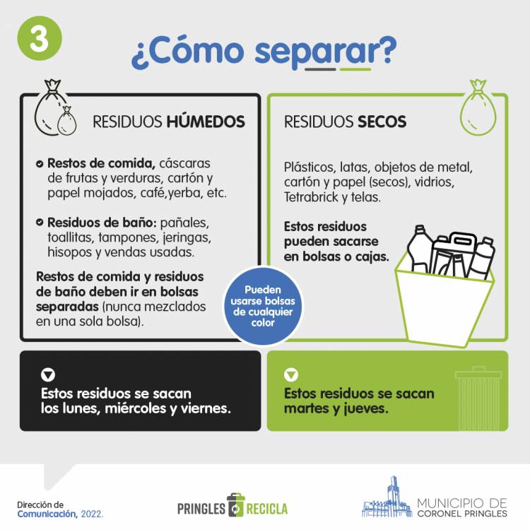 Hay que separarlos en húmedos y secos. “Los que contengan una determinada cantidad de agua se recolectarán un día y los que no tienen agua y están limpios se recolectarán otros días. Nosotros vamos a repartir, casa por casa, un folleto para que la gente pueda identificar cuáles son los residuos secos y cuáles los húmedos”, señaló la Directora de Ambiente y Espacio Público, quien alentó que ante cualquier duda o consulta podrán llamar al 46-4037 (de lunes a viernes, de 7 a 13 horas).