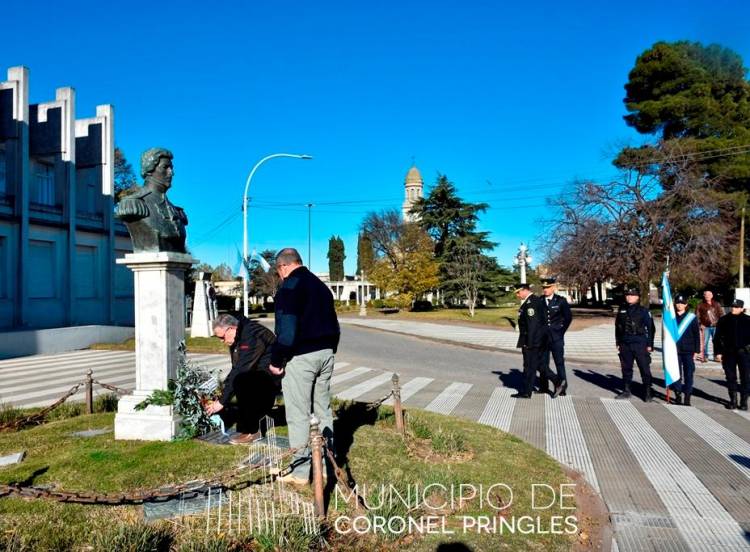 Representantes de la Asociación Cultural Sanmartiniana y del Instituto Nacional Browniano depositaron una ofrenda floral a los pies del busto del Coronel Juan Pascual Pringles.