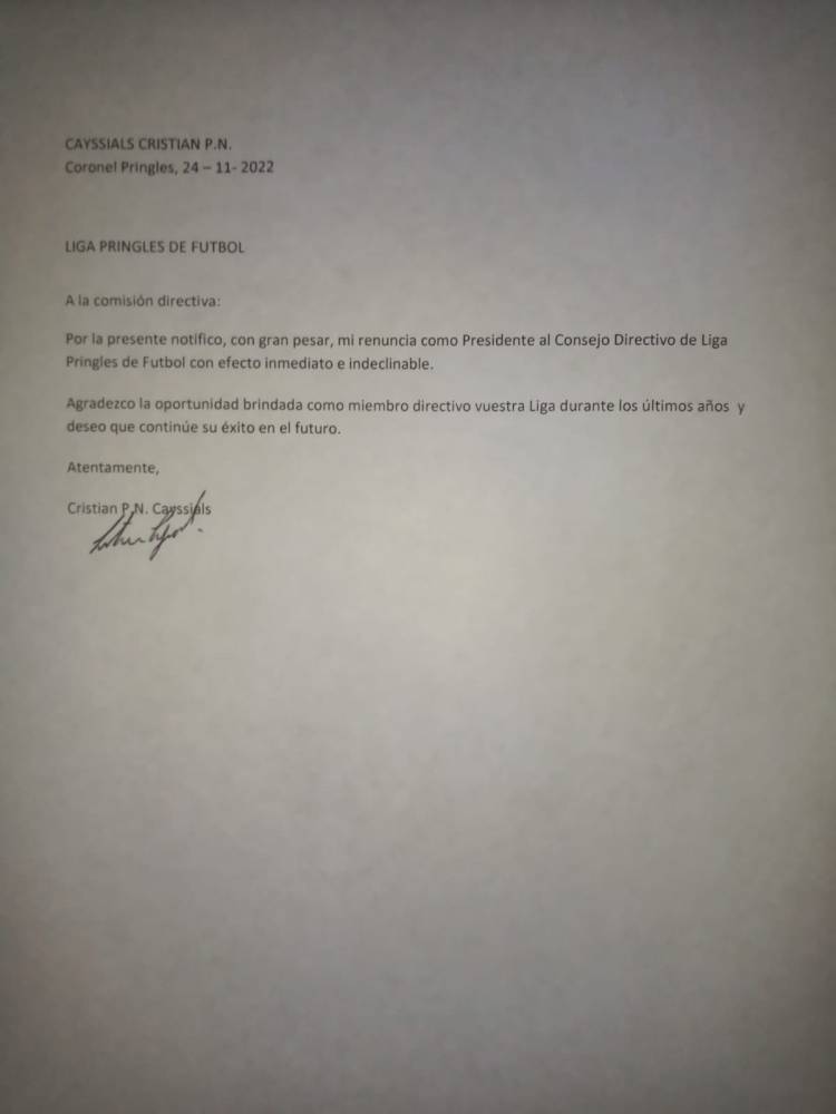 A través de una nota Cristian Cayssials hizo conocer al Consejo Directivo de la Liga Pringles de Fútbol su dimisión como titular de la misma con efecto "inmediato" e "indeclinable".