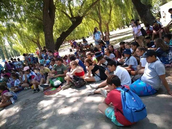 Centrado en el predio del Balneario Municipal y Polideportivo en Indio Rico, disfrutando a pleno desde piletas a todas sus instalaciones. Organizados en grupos desarrollan actividades diversas.
