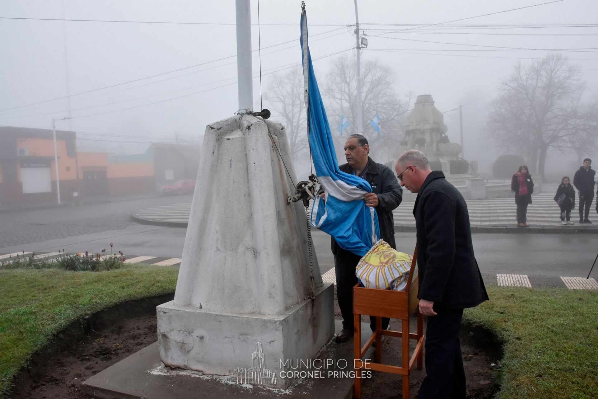 El jefe comunal y elSecretario de Gobierno y Seguridad, Sergio Jackson, izaron el Pabellón Nacional con el acompañamiento musical del Himno Nacional a cargo de la Banda Ceferino Namuncurá.