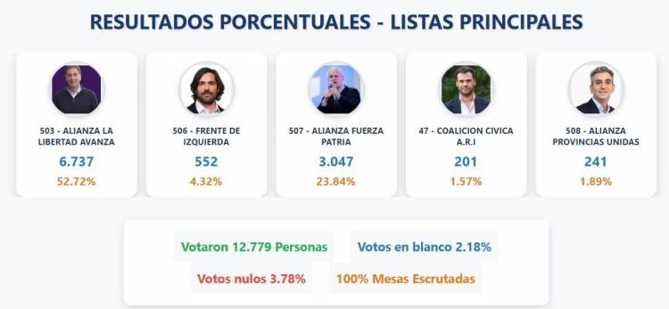 En segundo lugar se ubicó Fuerza Patria con el 23% y tercero fue el Frente de Izquierda con el 4%.