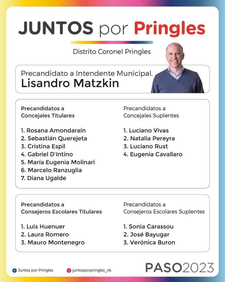 Esta Lista nos llena de orgullo y esperanza, conformada por gente que viene sumando, cada uno desde su lugar, para un Pringles que sea presente y futuro. Con Rosana Amondarain encabezando el grupo de Concejales y Luis Huenuer el de Consejeros Escolares, ambos con una sólida visión de lo que hace falta, comprometidos a lograrlo y que suman, junto a cada integrante de nuestra Lista, la voluntad y la fuerza para seguir avanzando.