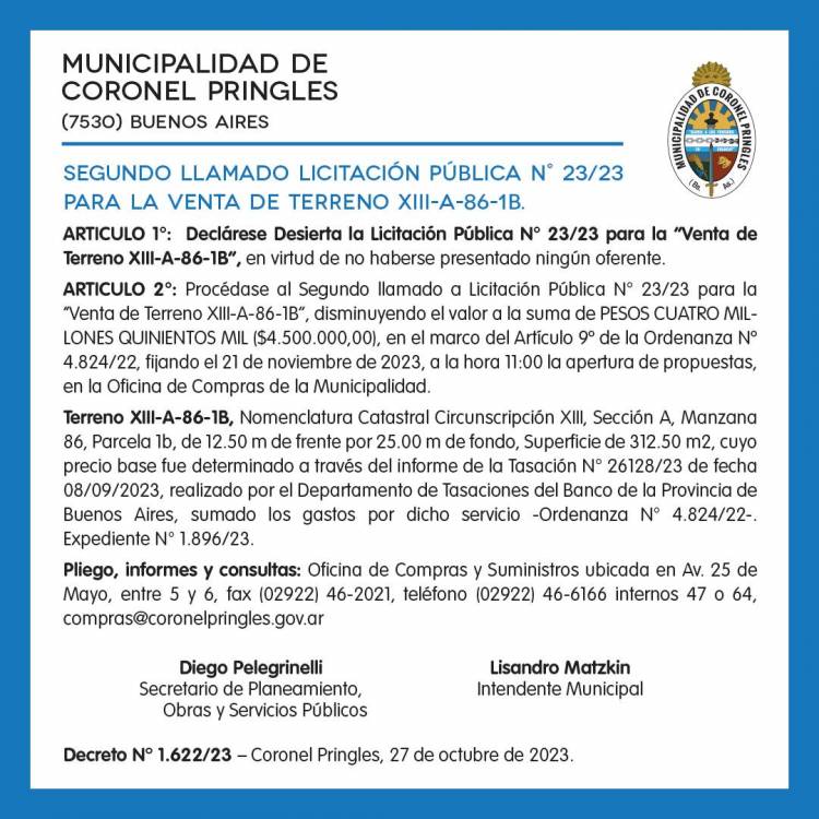 Informes, consultas y pliegos en: Oficina de Compras y Suministros, planta baja del Palacio Municipal, lunes a viernes de 7 a 13 horas, teléfono (2922) 46-6166, internos 47 o 64; correo electrónico compras@coronelpringles.gov.ar