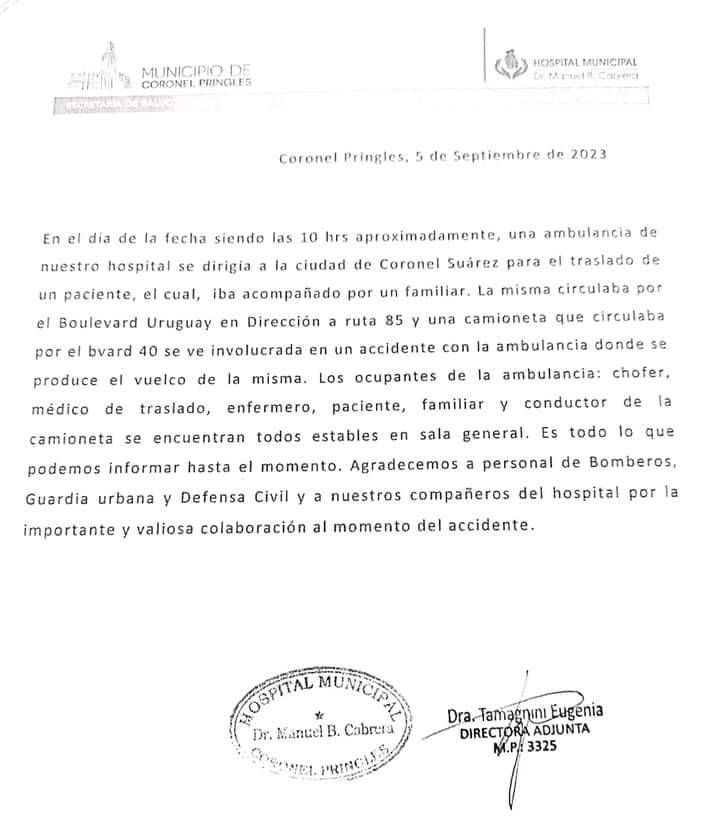 Comunicado del Hospital Municipal Dr. Manuel B. Cabrera sobre el estado de salud de los ocupantes de la ambulancia que sufrió un accidente en el día de hoy (martes 5 de septiembre).