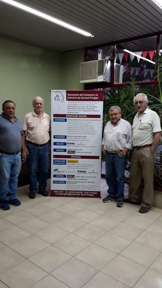 Un grupo de miembros de la Comisión Directiva exhibió el banner de la Asociación del Comercio y la Industria de Coronel Pringles.