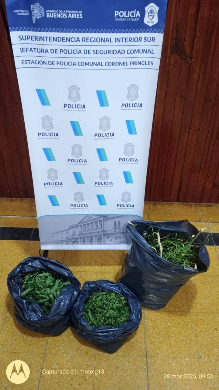 El día viernes 27 de Marzo, siendo las 03:30 hs personal policial de esta dependencia que se hallaba de recorrida por la calle Italia al 800, observaron a dos masculinos que salían corriendo de la parte posterior de una camioneta, transportando consigo un bidon de agroquimicos, marca Sigma, de color verde. Siendo interceptados, se procedió a la aprehensión de DRAGANI ALEJANDRO EDUARDO (18) y DRAGANI ALEXIS ABEL (22), por el delito de HURTO DE FLAGRANCIA. Se pudo identificar a un vecino del lugar como el propietario de dicho agroquímico. No obstante ello se pudo constatar que los hermanos aprehendidos llevaban consigo una mochila conteniendo una planta de cannabis, recientemente extraída del suelo, aún con su terrón de tierra. Se procedió a labrar actuaciones por Infracción a la Ley 23733 con intervención de la Unidad Funcional de INstrucción y Juicio nro Diecinueve del Departamento Judicial Bahia Blanca.