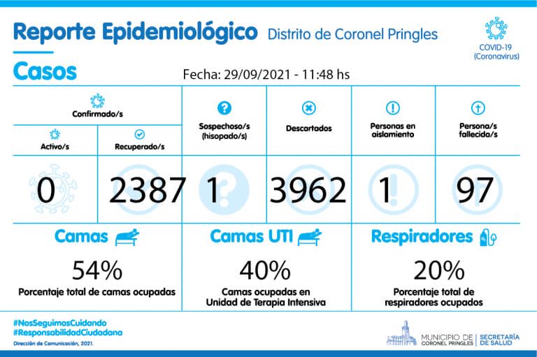 Determinaciones realizadas en laboratorios privados y Hospital, por diferentes métodos no se registraron hisopados con resultado positivo y se reportó 1 alta para el día de hoy, de esta manera el total de activos es 0 y la cifra de los pacientes recuperados aumenta a siendo 2387.