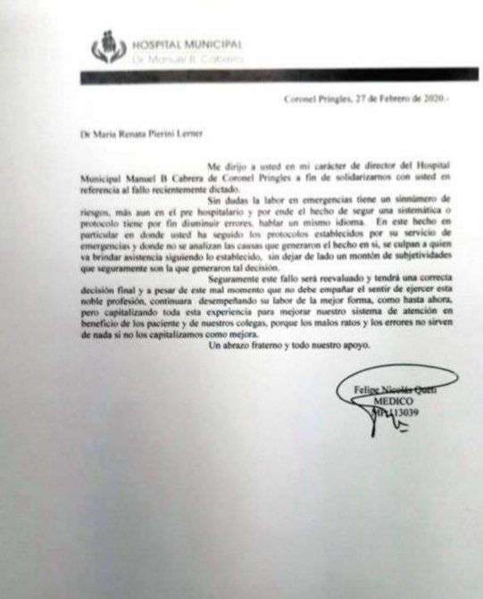 El actual Director del Hospital Municipal de Coronel Pringles, Nicolás Queti, señaló "Seguramente este fallo será reevaluado y tendrá una correcta decisión final".