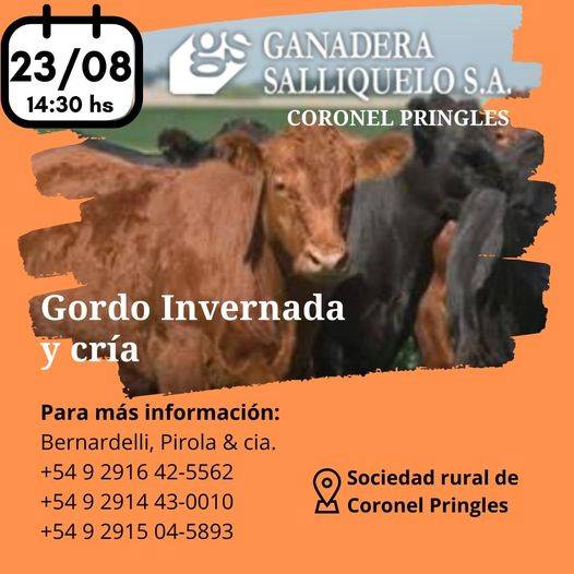 La firma Bernardelli, Pirola y Cía local, representante de Ganadera Salliqueló S.A., anuncia que su próximo Remate Feria será el martes 23 de agosto de 2022, con vacunos de Gordo, Invernada y Cría a la venta, en el predio ferial de la Sociedad Rural, a partir de las 14:30 horas.