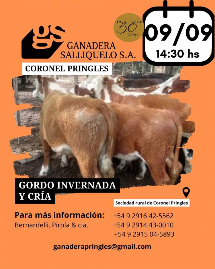 La firma local Bernardelli, Pirola y Cía, representante de Ganadera Salliqueló S.A., anuncia que su próximo Remate Feria de Gordo, Invernada y Cría, se realizará el martes 9 de septiembre de 2025, en el predio ferial de la Sociedad Rural, a partir de las 14:30 hs.